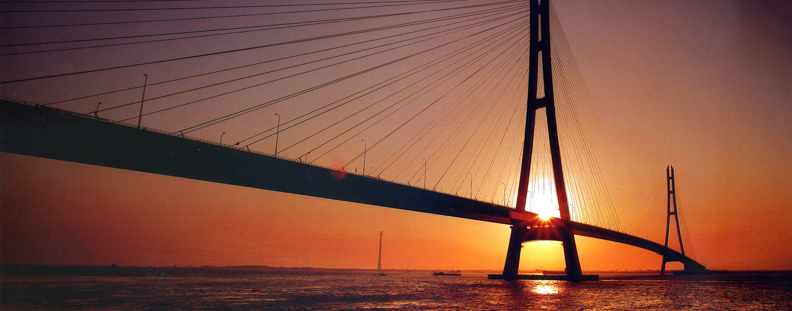 南京長江第三大橋(以下簡稱“南京三橋” ) 是滬蓉(上海至成都)國道主干線在南京地區(qū)跨越長江的重要過江通道,南起南京繞城公路劉村互通, 北至浦口境內(nèi)寧合高速公路張店互通,全線15.6公里,按雙向六車道高速公路標(biāo)準(zhǔn)設(shè)計(jì),其中跨江大橋長4744米,南岸接線為3083米,北岸接線為7773米,主跨為648米雙塔雙索面鋼塔鋼箱梁斜拉橋,橋塔高度為215米,最大通行高度為32米,可以通航萬噸級(jí)船舶。三橋全線共設(shè)劉村互通、天后村互通、高旺互通和張店互通四座互通立交;設(shè)服務(wù)區(qū)兩處,主線收費(fèi)站一處。工程于2003年8月正式開工,2005年10月7日提前22個(gè)月建成通車,總投資33.9514億元,作為特大型橋梁的鋼塔鋼箱梁斜拉橋/索橋位居當(dāng)時(shí)中國第一、世界第三。在國家級(jí)竣工驗(yàn)收中,三橋獲得綜合評(píng)分97.35的高分,工程等級(jí)優(yōu)良。此后,三橋還先后獲得第七屆中國土木工程詹天佑獎(jiǎng)、2006年度中國公路學(xué)會(huì)科學(xué)技術(shù)進(jìn)步特等獎(jiǎng)、2007年度美國IBC頒發(fā)的“古斯塔·林德恩斯”獎(jiǎng)?wù)碌攘?xiàng)大獎(jiǎng),為中國橋梁史寫下了濃墨重彩的一筆。